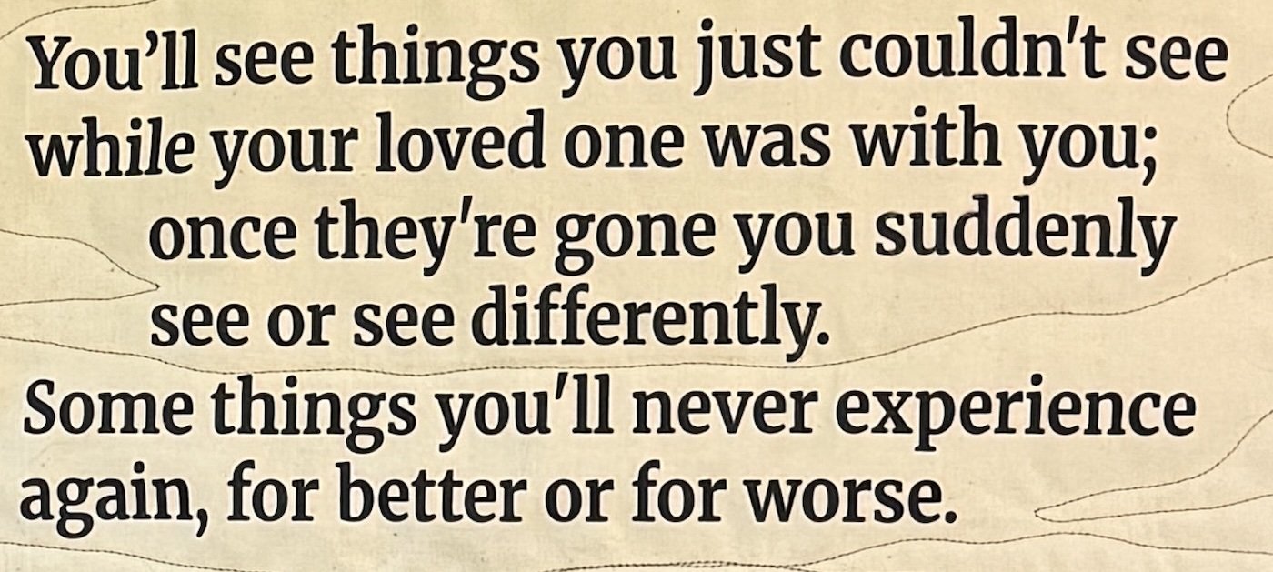 I was coloring and sketching and I heard her saying she would miss coloring. There was a bittersweetness about it. I knew I would never hear her voice in this world again. She’d already moved on. Even now, writing these few words about it, I’m starting to cry all over again. There was something about my relationship with her that defies explanation. She was my mother, yes, but she was also my equal, my friend, and sometimes my playmate or fellow adventurer. I’ll never laugh like that again, not with someone else, not like she and I laughed together.