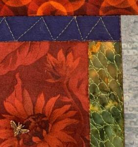 This piece began with a Start from January 2022. I loved the central image of monochromatic sunflowers. I wanted to play with the oranges and blacks evoked by that image, adding the yellows I think of when I think of sunflowers.